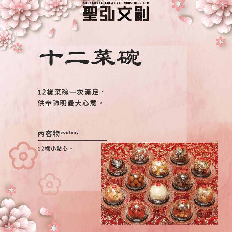 產品名稱:十二菜碗 產品數量:十個道菜碗 產品內容物:十二樣小點心 供奉神明最大心意,12樣菜碗一次滿足! LINE客服人員:@sh003