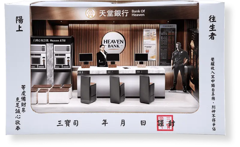 產品名稱:「紙紮天堂銀行」 ※材質:精緻紙材 ※附受用紙、封條 本公司提供專業「客製化紙紮」服務 LINE客服人員:@sh003 – 適用場地:自宅、棺內、金爐、殯儀館、火化場 台灣製造 品質優良可靠 特殊貨運配合 全台皆可配送 【24小時客服、全台最快隔天配送】 【本公司另有緊急配送客戶服務】