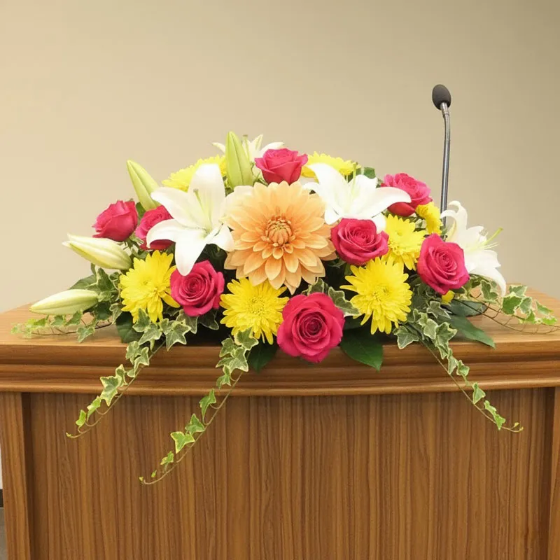 此款為:「講桌花」款式 桌花用途:開幕、祝賀、追思 皆可設計 – 桌花含意: 整體儀式感,讓現場更有層次與質感。 營造浪漫與優雅氛圍。