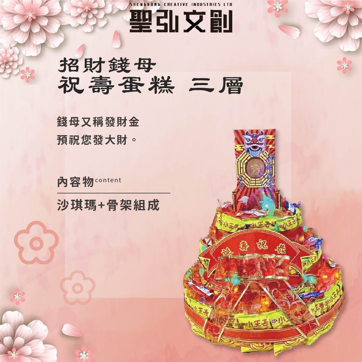 產品特色:招財開運錢母點綴,招財喜氣祝壽蛋糕
