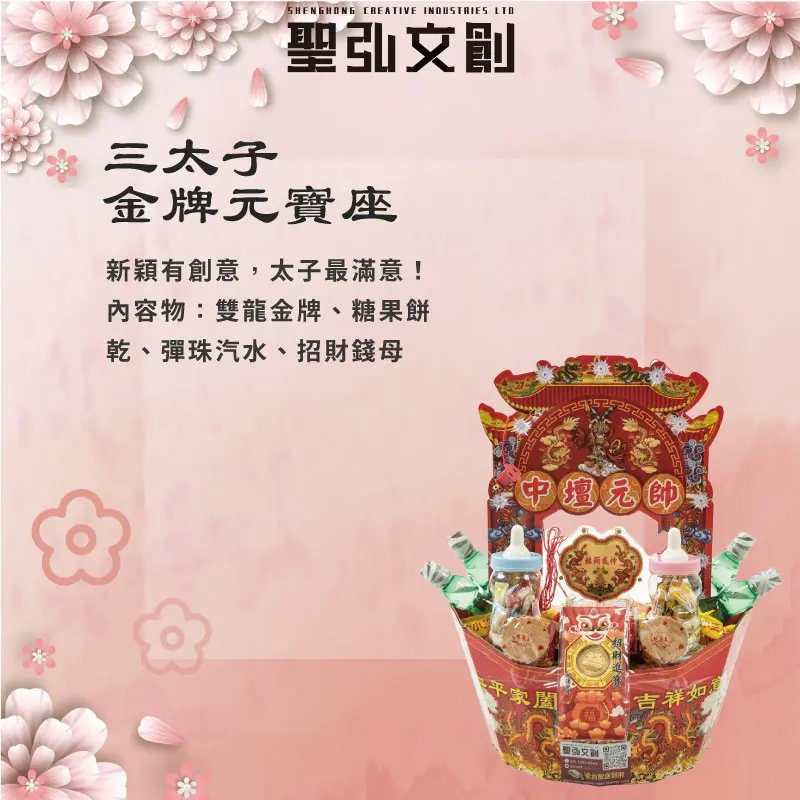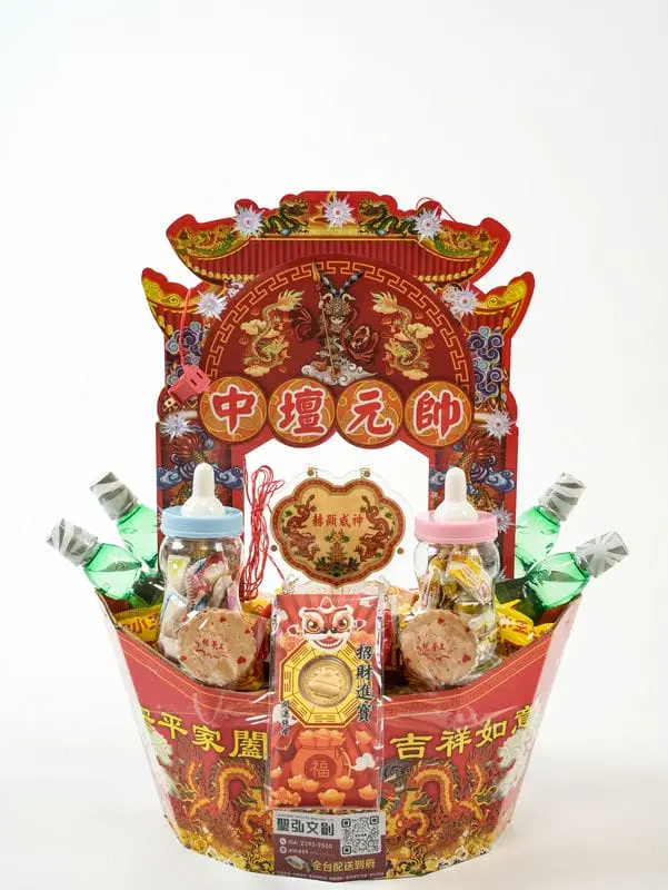 商品內容物:糖果餅乾、吉祥飾品、壽桃壽麵、招財錢母