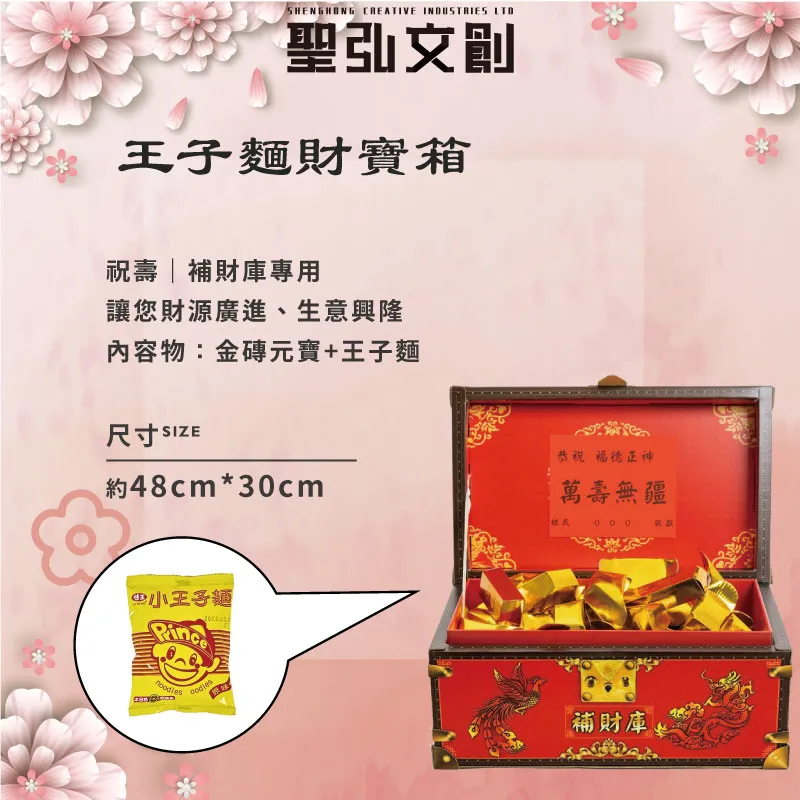 產品名稱:王子麵財寶箱 產品數量:一個 產品材質:金紙 產品特色:由金紙元寶、金磚、王子麵打造財寶箱,補財補運、祈求順利、生意興隆,讓你好運不斷旺旺來! LINE客服人員:@sh003