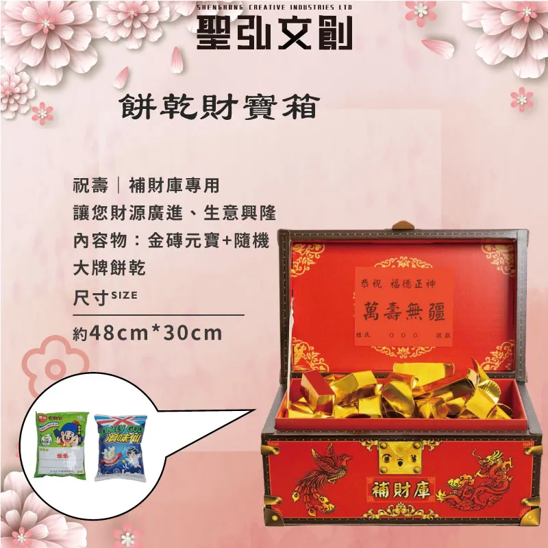 產品名稱:餅乾財寶箱 產品數量:一個 產品材質:金紙 產品特色:由金紙元寶、金磚、餅乾(隨機大牌餅乾)打造財寶箱,補財補運、祈求順利、生意興隆,讓你好運不斷旺旺來! LINE客服人員:@sh003