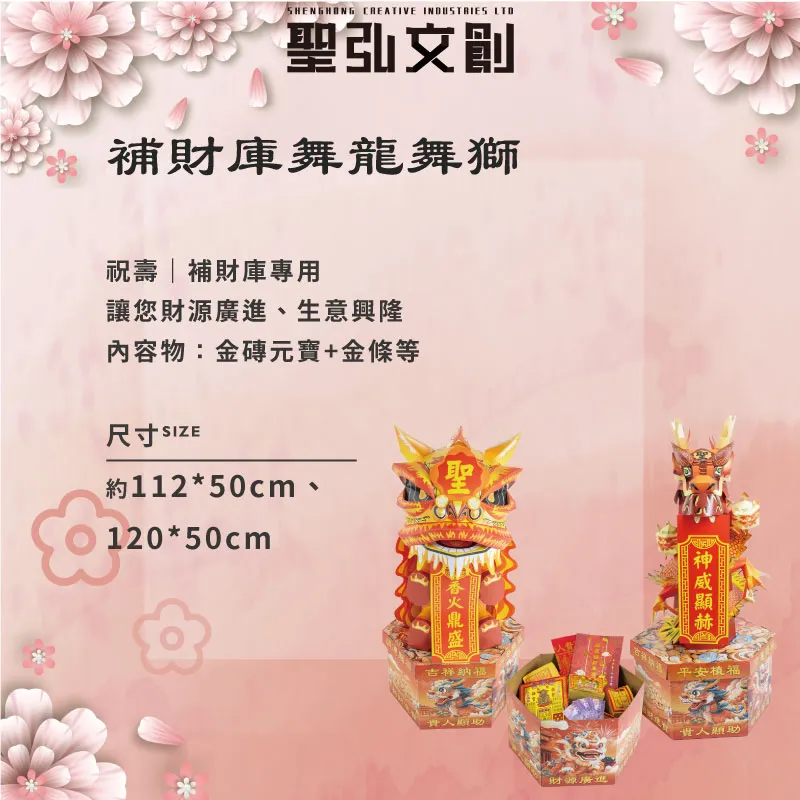 產品名稱:補財庫舞龍舞獅 產品數量:各一個 產品材質:金紙 產品特色:由金元寶、金磚等補財商品打造金龍、金獅,補財補運、祈求順利、生意興隆,讓你好運不斷旺旺來! LINE客服人員:@sh003